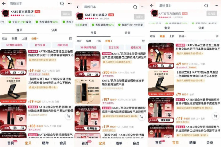 凭借几款具有辨识度的单品,KATE很快在中国市场站稳脚跟。其中最具代表性的三色眉粉、骨干眼影等产品,在电商平台上长期保持稳定销量。